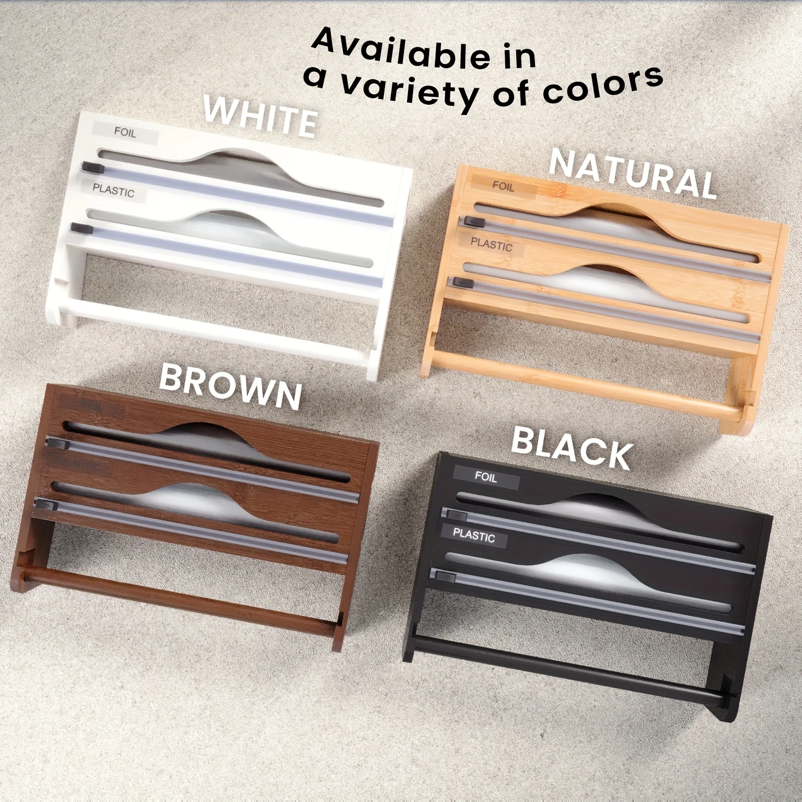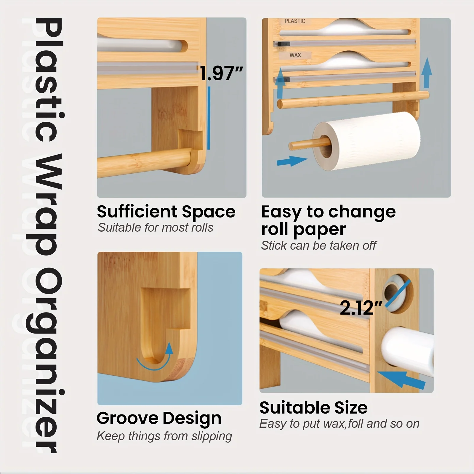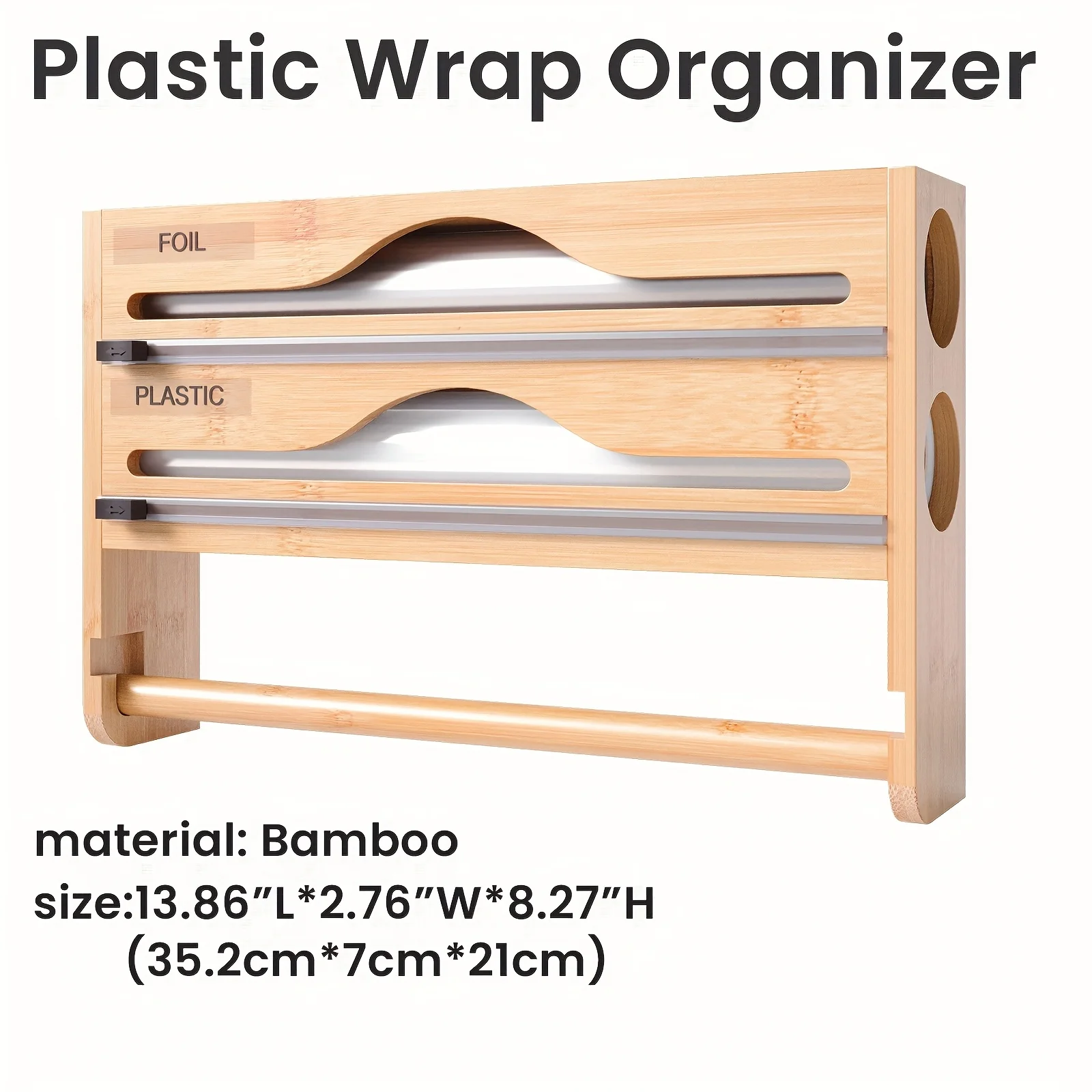 Bamboo 4-in-1 Wall Mount Foil & Plastic Wrap Organizer with Cutter - Kitchen Storage Solution for Wax Paper.